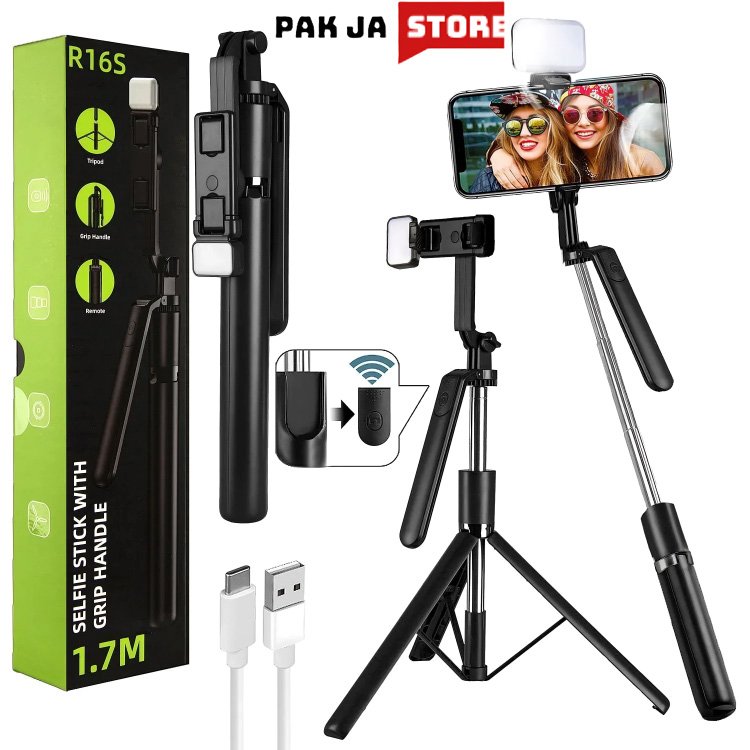 R16S 1.7M Extendable Selfie Stick with Tripod Stand, Adjustable Grip Handle, Wireless Bluetooth, Rechargeable LED Light, and USB Charging – Perfect for Mobile Photography, Video Recording, Vlogging, and Live Streaming with Enhanced Stability