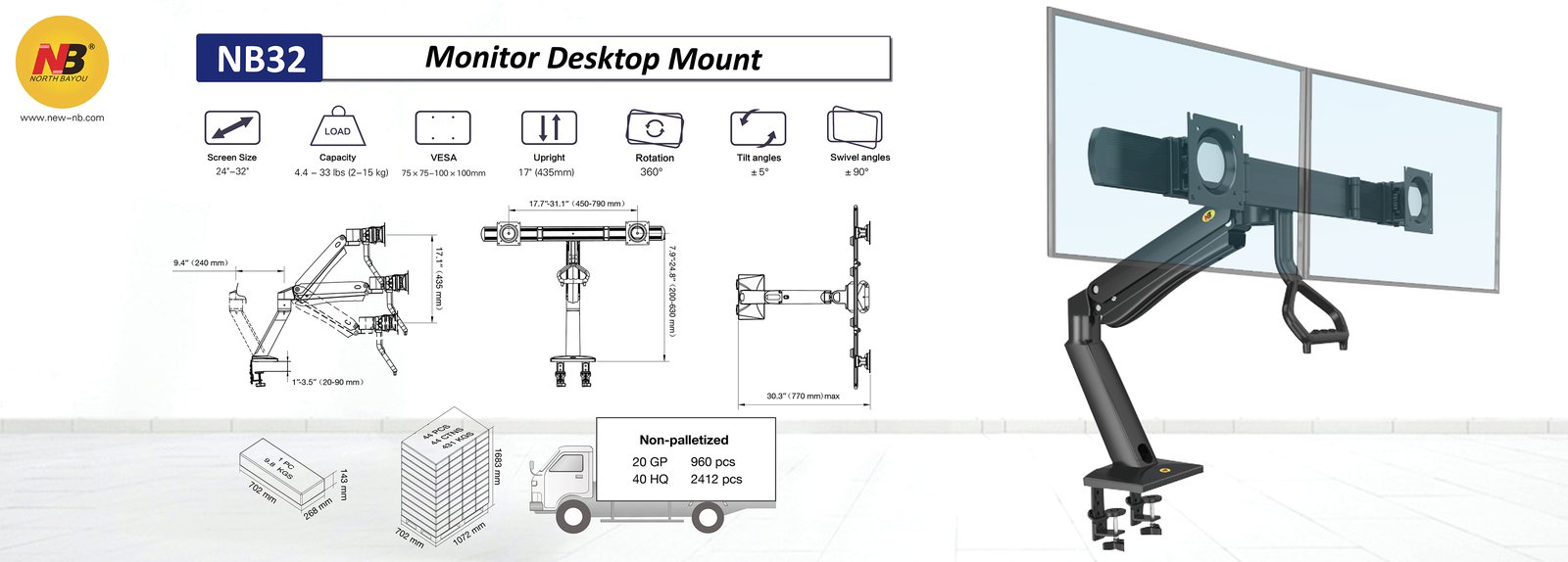 NORTH BAYOU NB32 Gas Strut 24-32 inch Dual Screen Monitor
