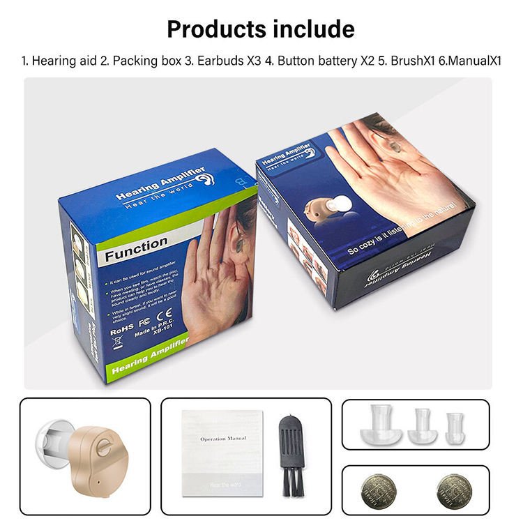 • What’s in the Box: Hearing Amplifier, Ear Tips, Cleaning Brush, and 2 x LR44 Button Cell Batteries.
